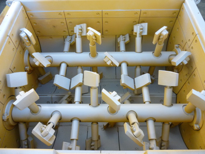 與日本德島大學共同研發(fā)的攪拌器具有以下特點:雙臥軸強制式攪拌器,長軸短臂,淺底結(jié)構(gòu)。內(nèi)部襯板、葉片采用高強度鑄鐵,耐磨,使用壽命長。攪拌器配有電加熱裝置,避免剛開機時缸冷和瀝青粘結(jié)。底門采用大型滑門,排料迅速。葉片實現(xiàn)三維空間的快速混合,提高拌和量和攪拌速度,從而使設(shè)備的生產(chǎn)能力得到了大幅提升。